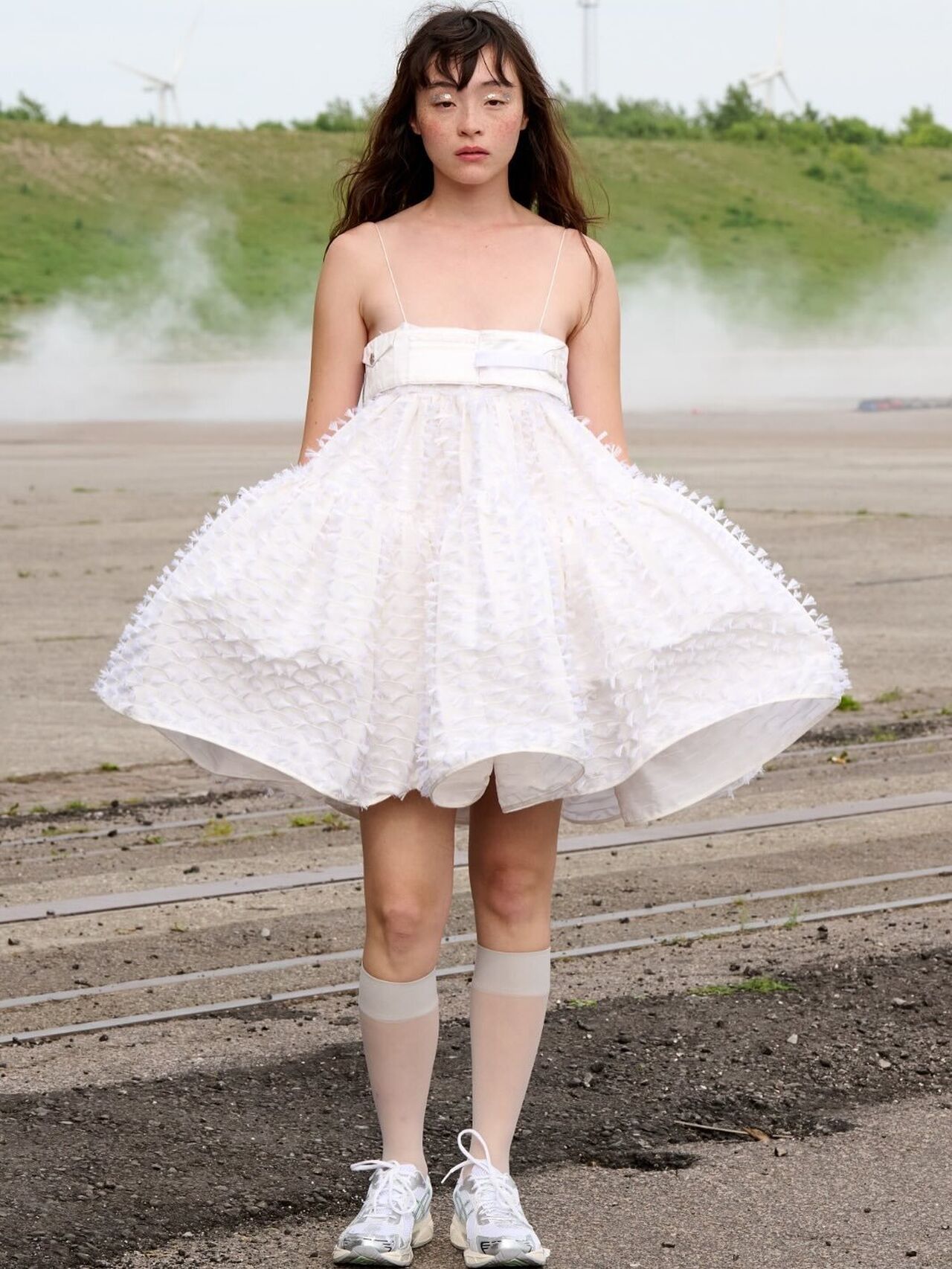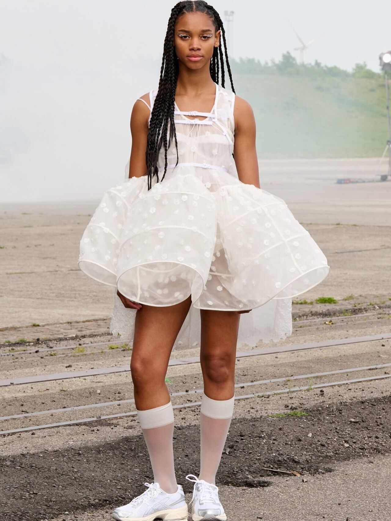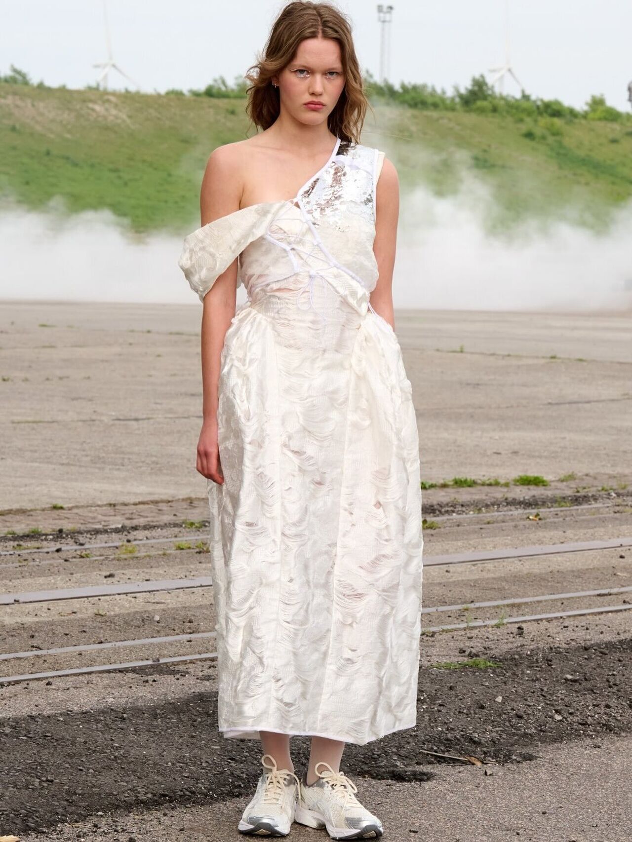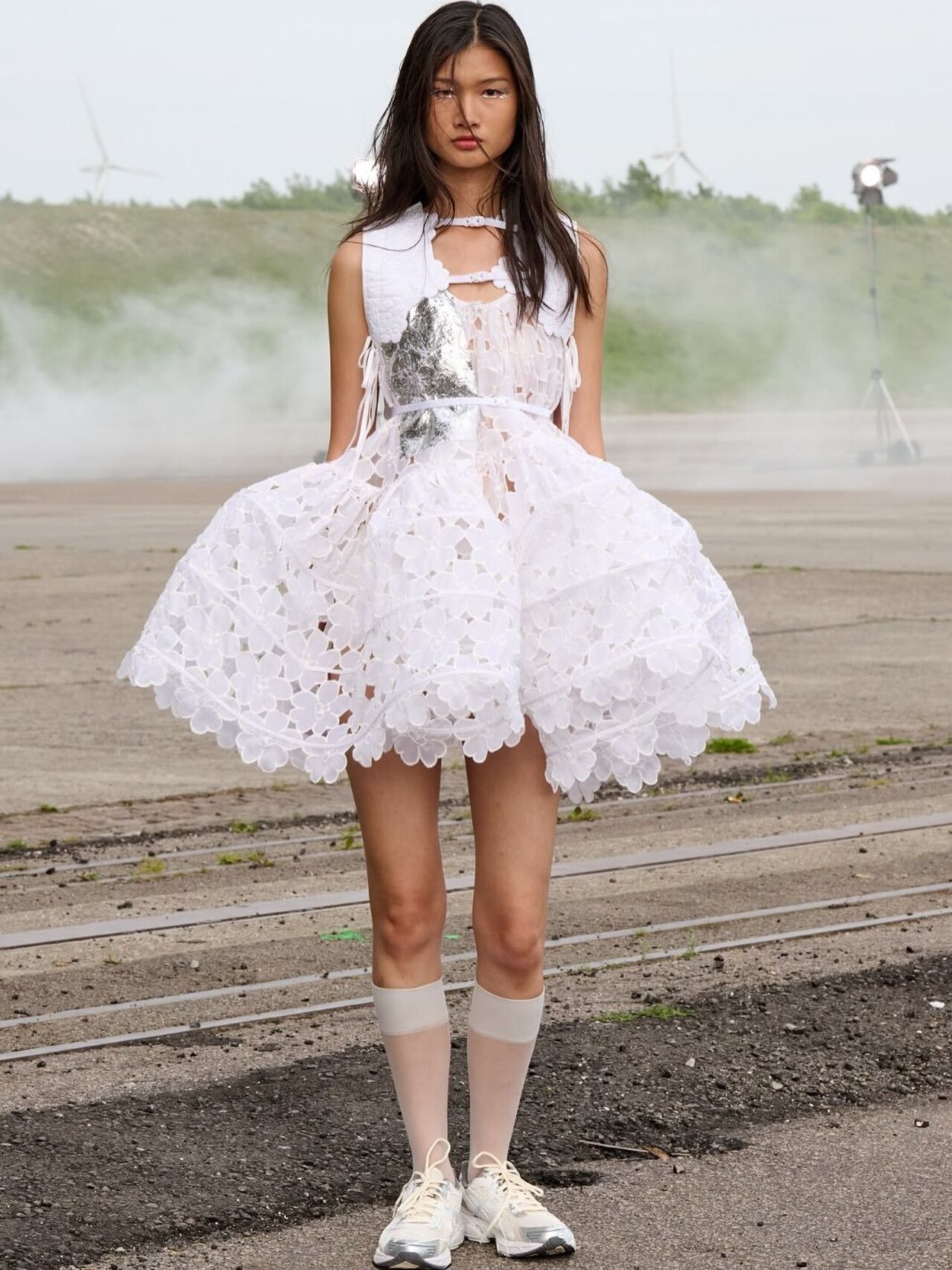 “Hana-Bi” @ceciliebahnsen 10-Year Anniversary Show, Presented at Copenhagen Fashion Week. Al models wear existing white @asics_sportstyle, reworked with embroidery, foil, or deconstructed linings. A