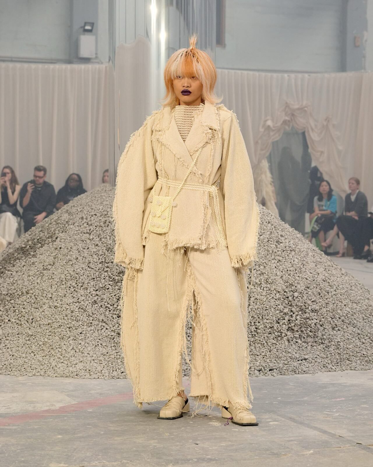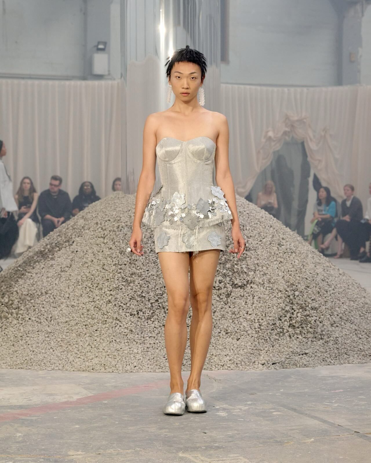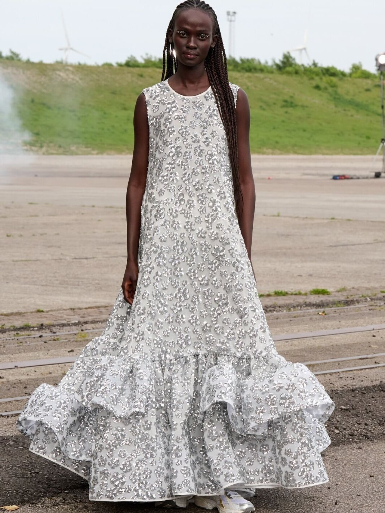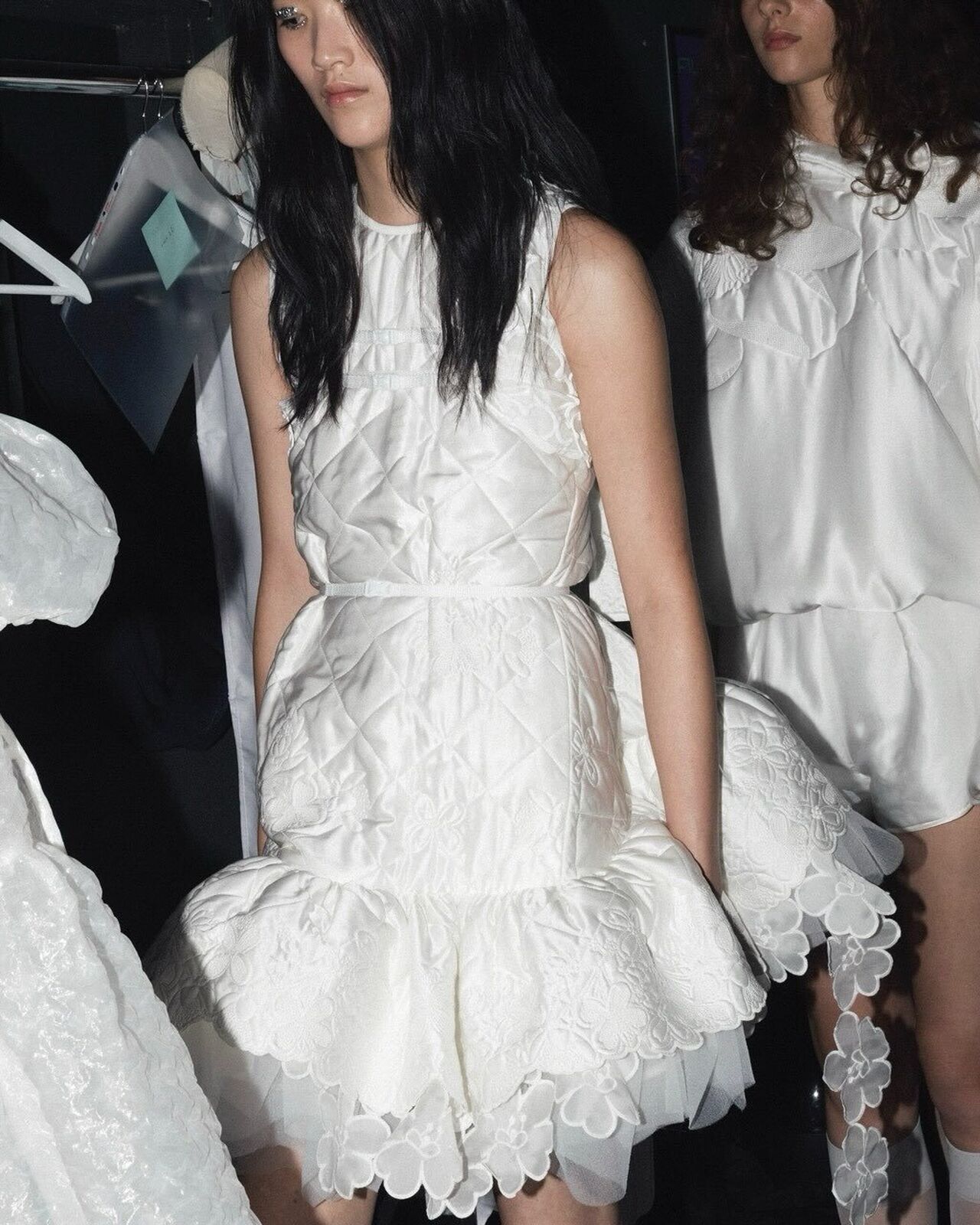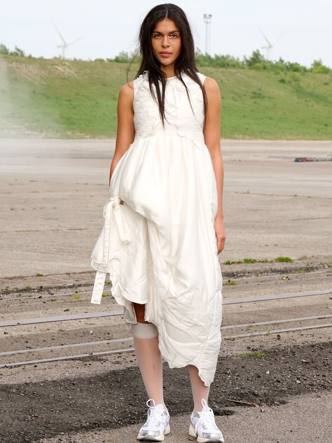 “Hana-Bi” @ceciliebahnsen 10-Year Anniversary Show, Presented at Copenhagen Fashion Week. Al models wear existing white @asics_sportstyle, reworked with embroidery, foil, or deconstructed linings. A