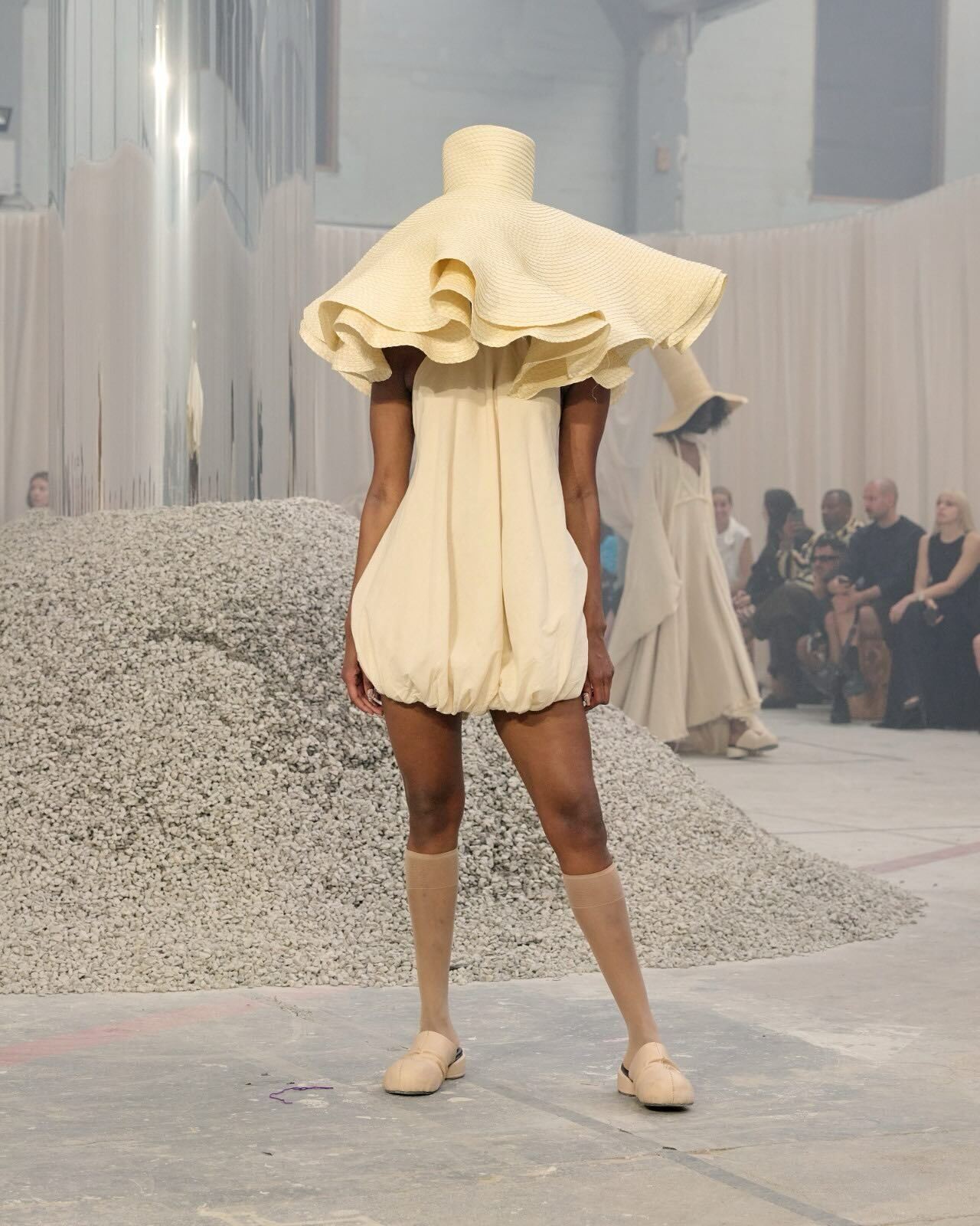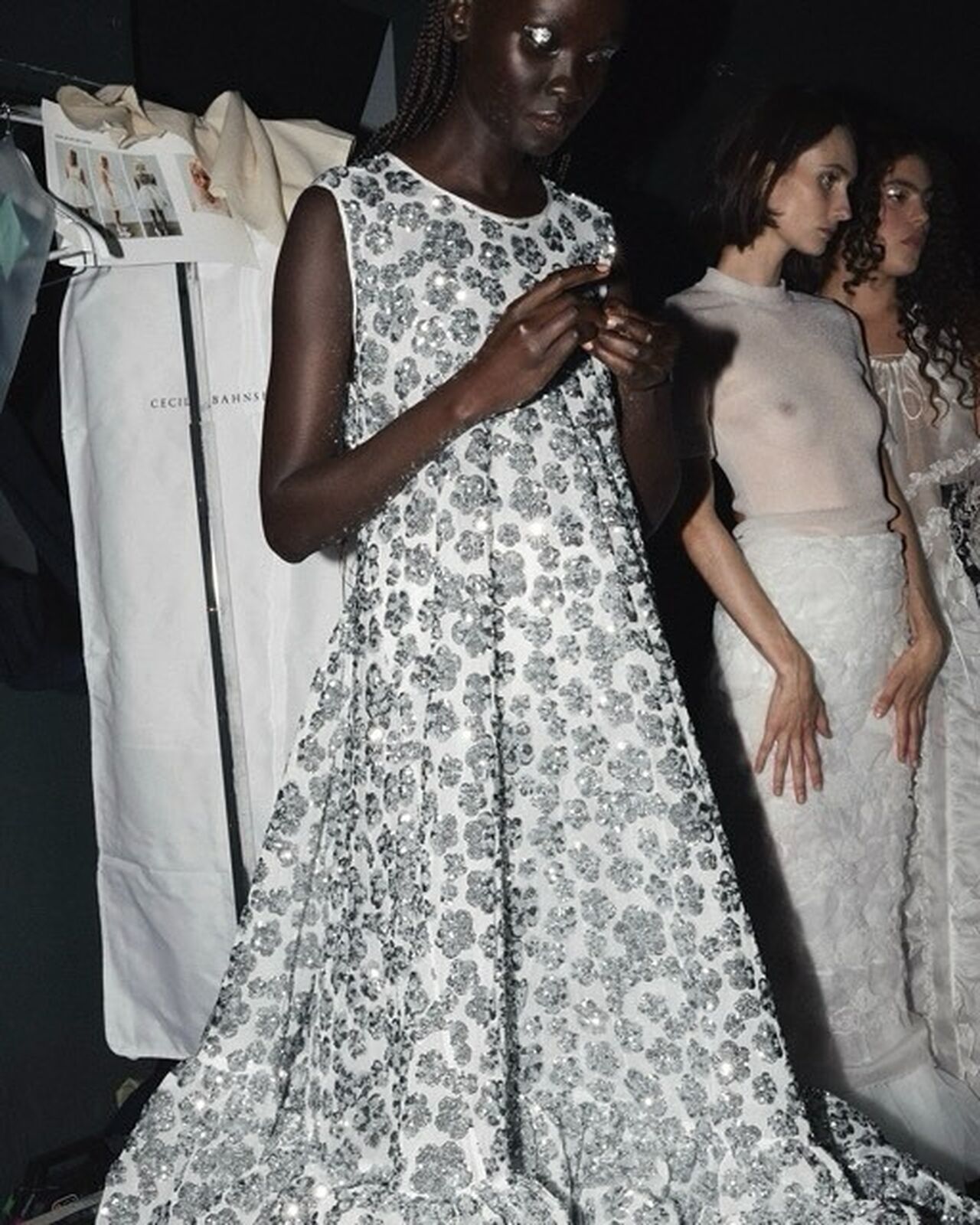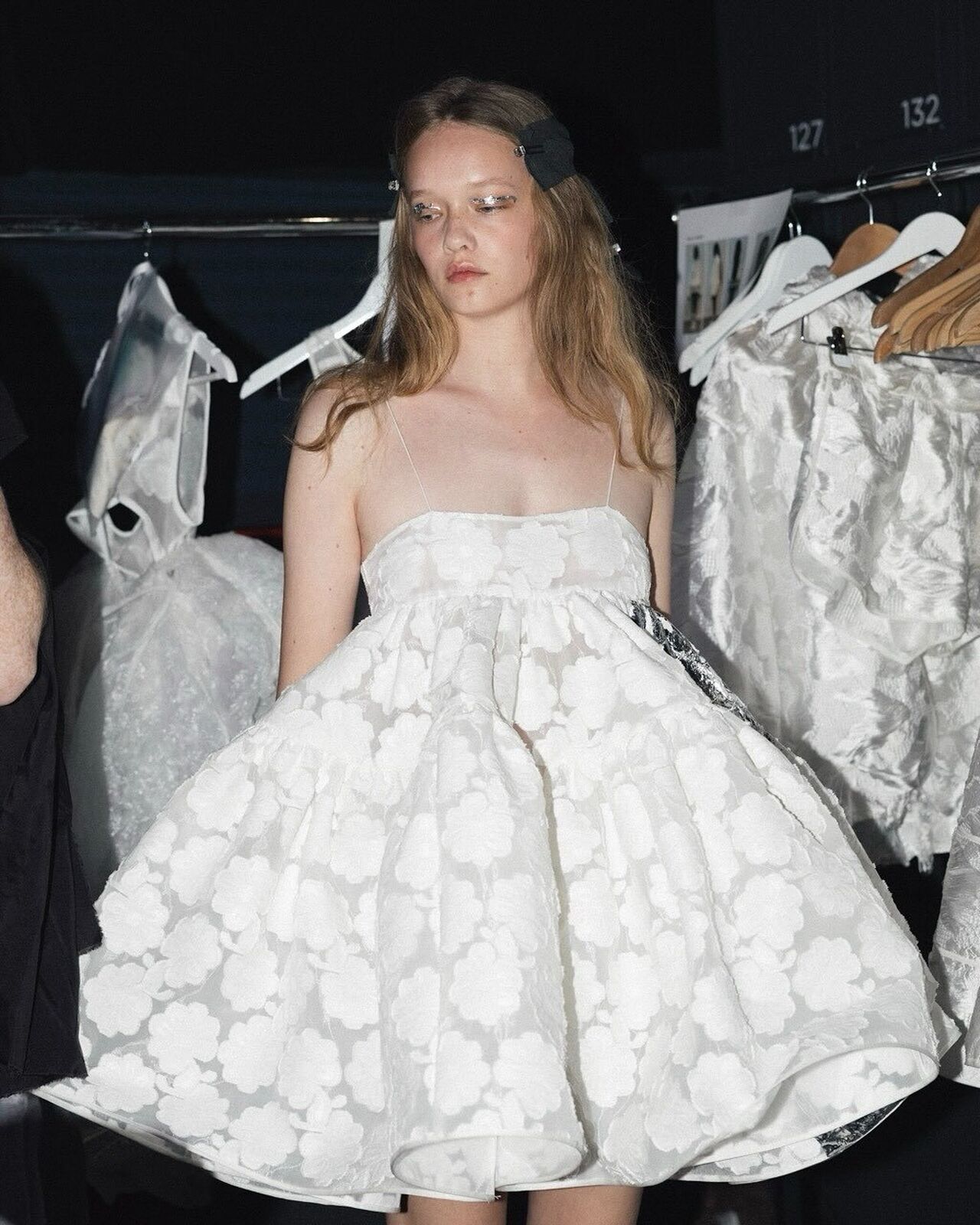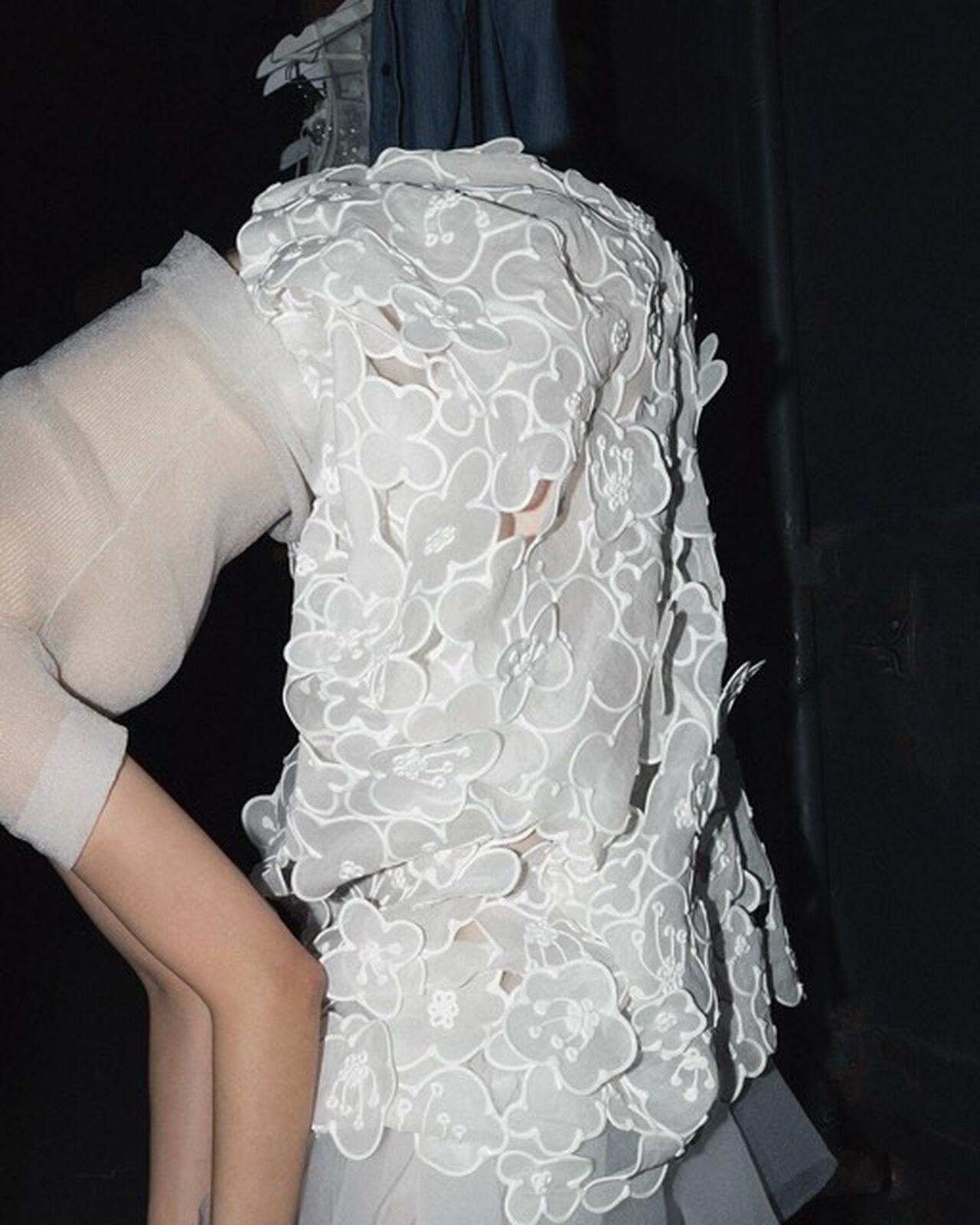 “Hana-Bi” @ceciliebahnsen 10-Year Anniversary Show, Presented at Copenhagen Fashion Week. Al models wear existing white @asics_sportstyle, reworked with embroidery, foil, or deconstructed linings. A
